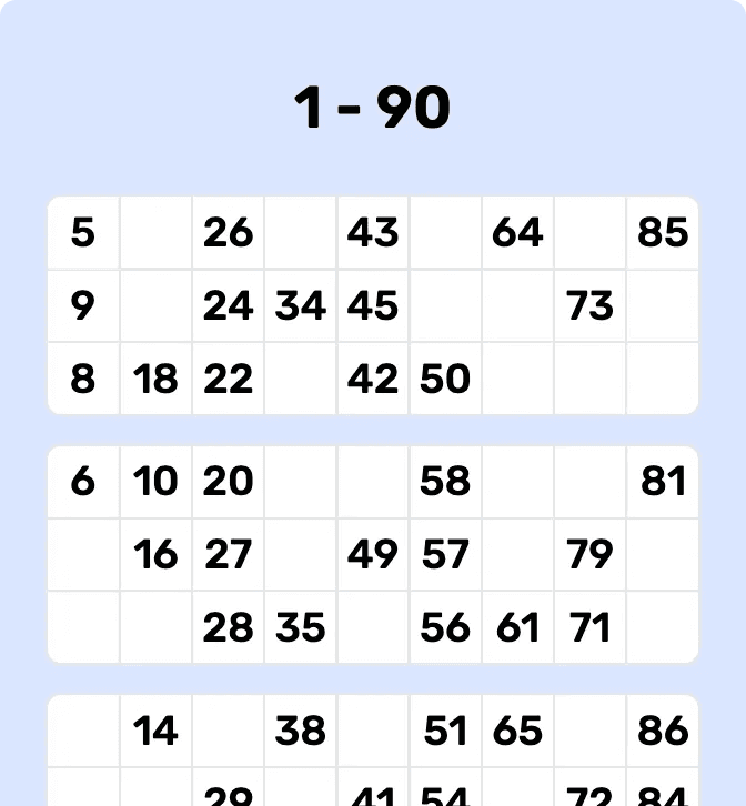 | 90-Ball Bingo | 90 | 3x9 grid (15 numbers) | One line, two lines, full house |